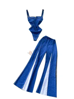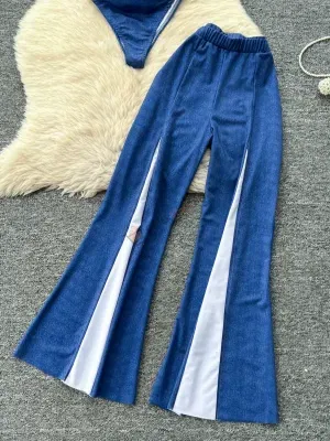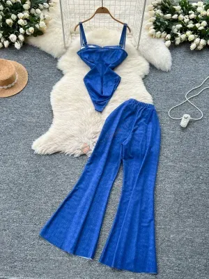 European and American fashionable sexy suspender waist jumpsuits for women’s design sense splicing high-waisted flared trousers summer two-piece set