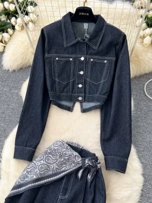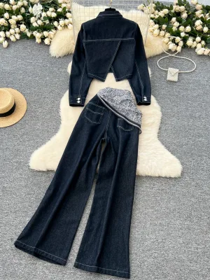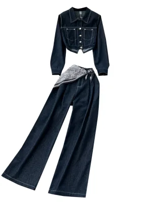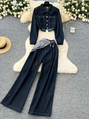 Retro fashionable suit for women loose and versatile short denim jacket high waist casual wide-leg pants two-piece suit
