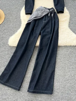 Be the first to review “Retro fashionable suit for women loose and versatile short denim jacket high waist casual wide-leg pants two-piece suit”